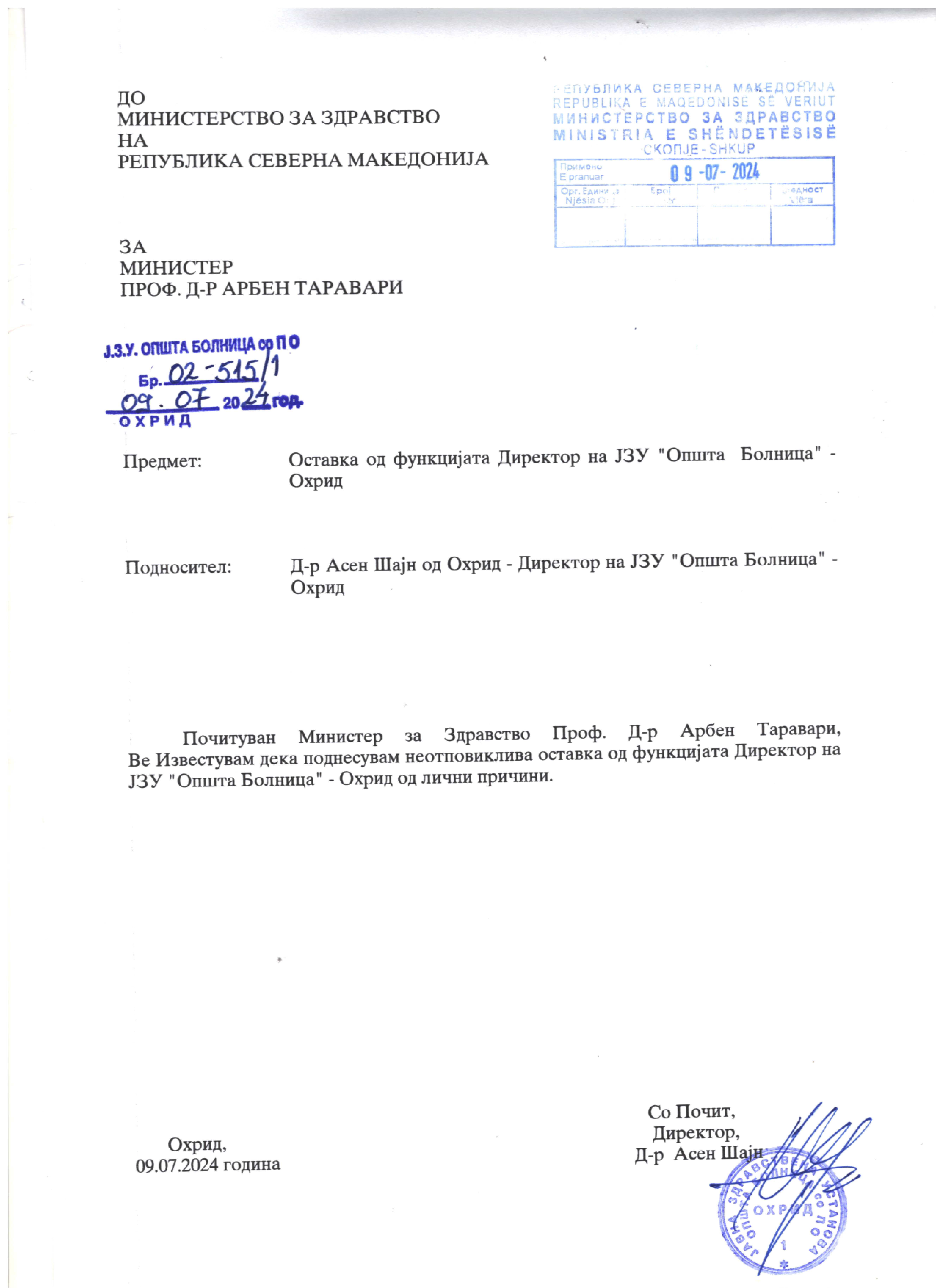 Кога бев именуван за Директор на ЈЗУ Општа Болница Охрид, наследив тешка финансиска состојба со блокирана сметка од август 2021 и бројни извршни решенија кои чекаа да бидат активирани, застој во испорака на основни медицински и други материјали, лекови, кадровски недостатоци од стручен кадар посебно во одделението за Педијатрија, со што мојата првична констатација за Болницата со која почнав да раководам беше катастрофална финансиска блокираност и општа организациона поставеност.